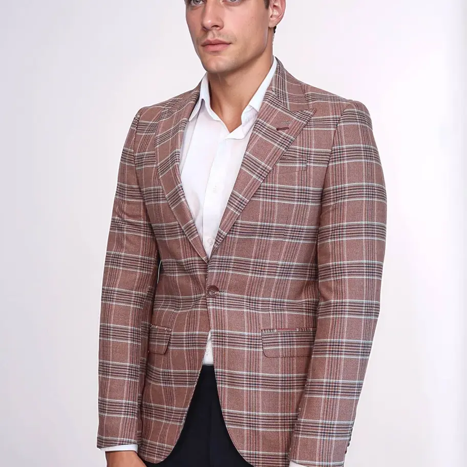 Checked Single Button Burgundy Men Blazer - Ridderkerk