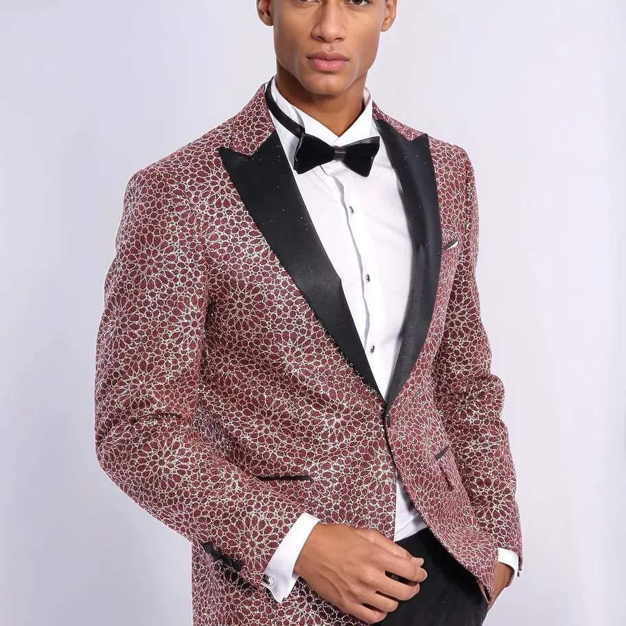 Tuxedo jackets, the indispensable representative of elegance in menswear, add a magical touch to your style with their sparkling patterns. Worn at special invitations, gala nights or special occasions, these jackets give your style an aristocratic air. Tuxedo jackets are one of the must-have pieces in every man's wardrobe and always guarantee your elegance with their slim fit cuts. With its embroidered floral patterns and elegant burgundy color, this men's tuxedo jacket offers a sophisticated style for special occasions, invitations, parties and graduation ceremonies. With this tuxedo jacket, you will make unforgettable memories and all eyes will be on you with impressive combinations. You can combine your burgundy embroidered floral print tuxedo jacket with a white shirt and black slim fit pants for a classic elegance. You can emphasize your elegance by completing your outfit with black oxford shoes and a black bow tie.