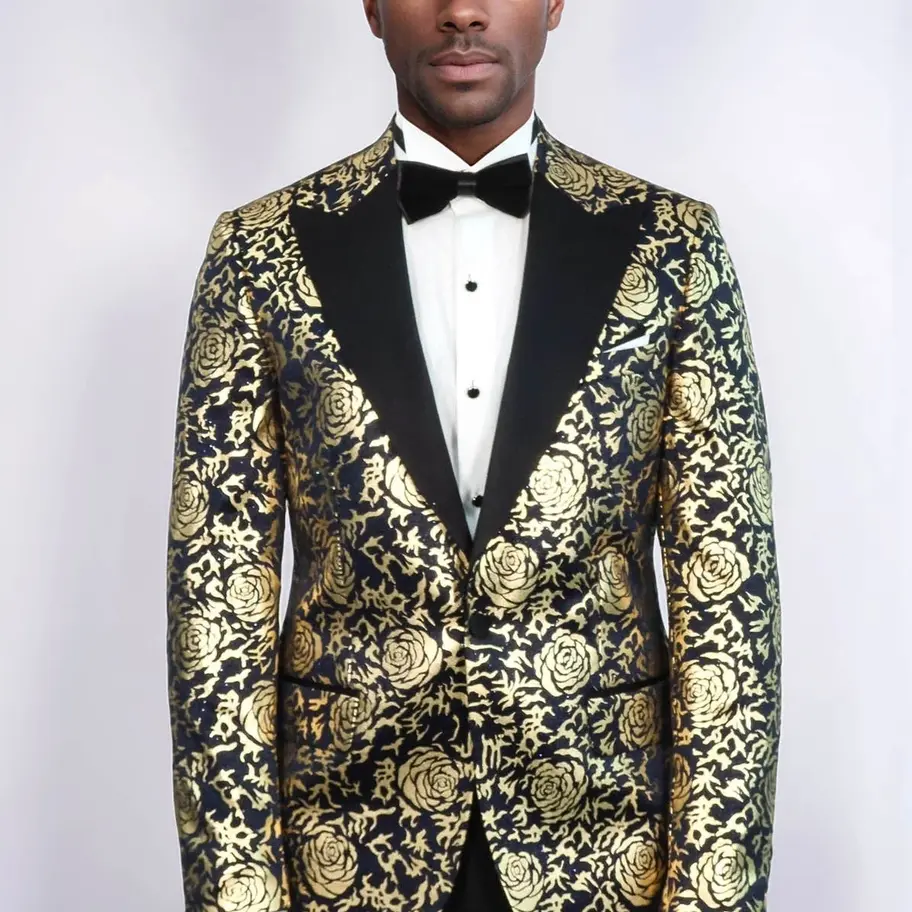 If you're looking to stand out from the crowd at your next special occasion, then look no further than this unique men's prom blazer. With its gold and rose patterns and peak lapel, this navy blue tuxedo blazer is perfect for any night event or wedding! Whether it's a groom's suit or an outfit for other special occasions, you'll be sure to make a lasting impression with its slim-fit style that exudes high fashion. Look your best on special occasions such as weddings and night events with this unique style men's prom blazer. Its slim fit design is tailored to fit the contours of your body perfectly while providing an elegant look.