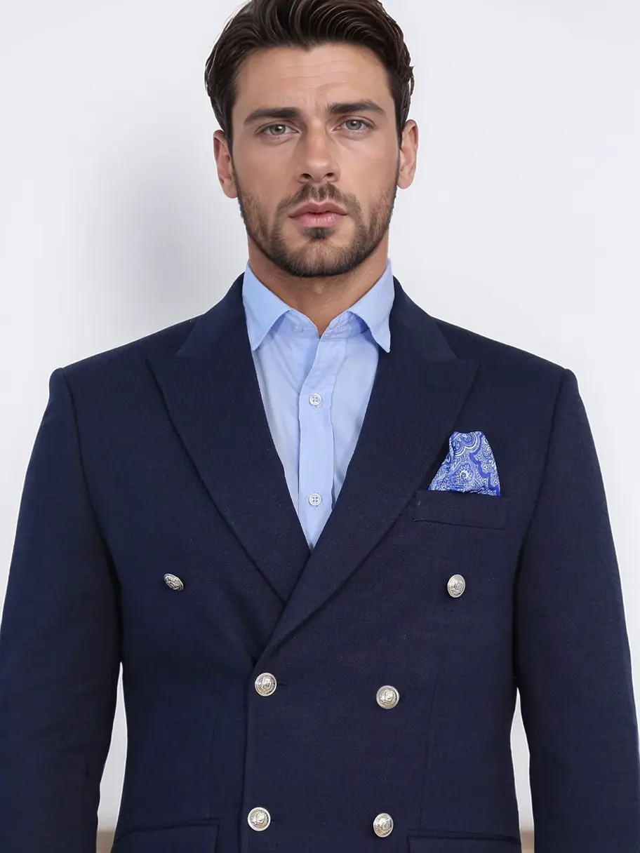 Navy Blue Solid Slim Fit Double-Breasted Blazer with Silver Metal Buttons – - Co