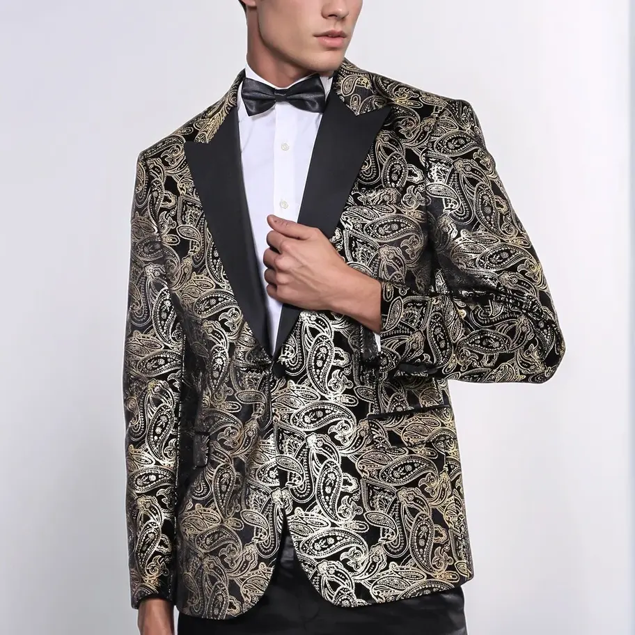 A statement piece that seamlessly combines sophistication with a touch of bold flair. This impeccably tailored blazer is designed to elevate your formal ensemble to new heights. The slim fit silhouette ensures a modern and polished look, flattering your physique without compromising on comfort. The gold paisley pattern adds a luxurious and distinctive touch, creating a visually striking contrast against the sleek black backdrop. Perfect for formal occasions, weddings, or gala events, this Tuxedo Blazer is a conversation starter. The attention to detail in both design and craftsmanship sets this piece apart, making it a go-to choice for those who appreciate refined style. Pair it with black dress pants for a complete formal look or experiment with dark jeans for a more contemporary twist. Make a bold statement and redefine elegance with our Slim Fit Gold Paisley Patterned Black Men's Tuxedo Blazer – where sophistication meets individuality.