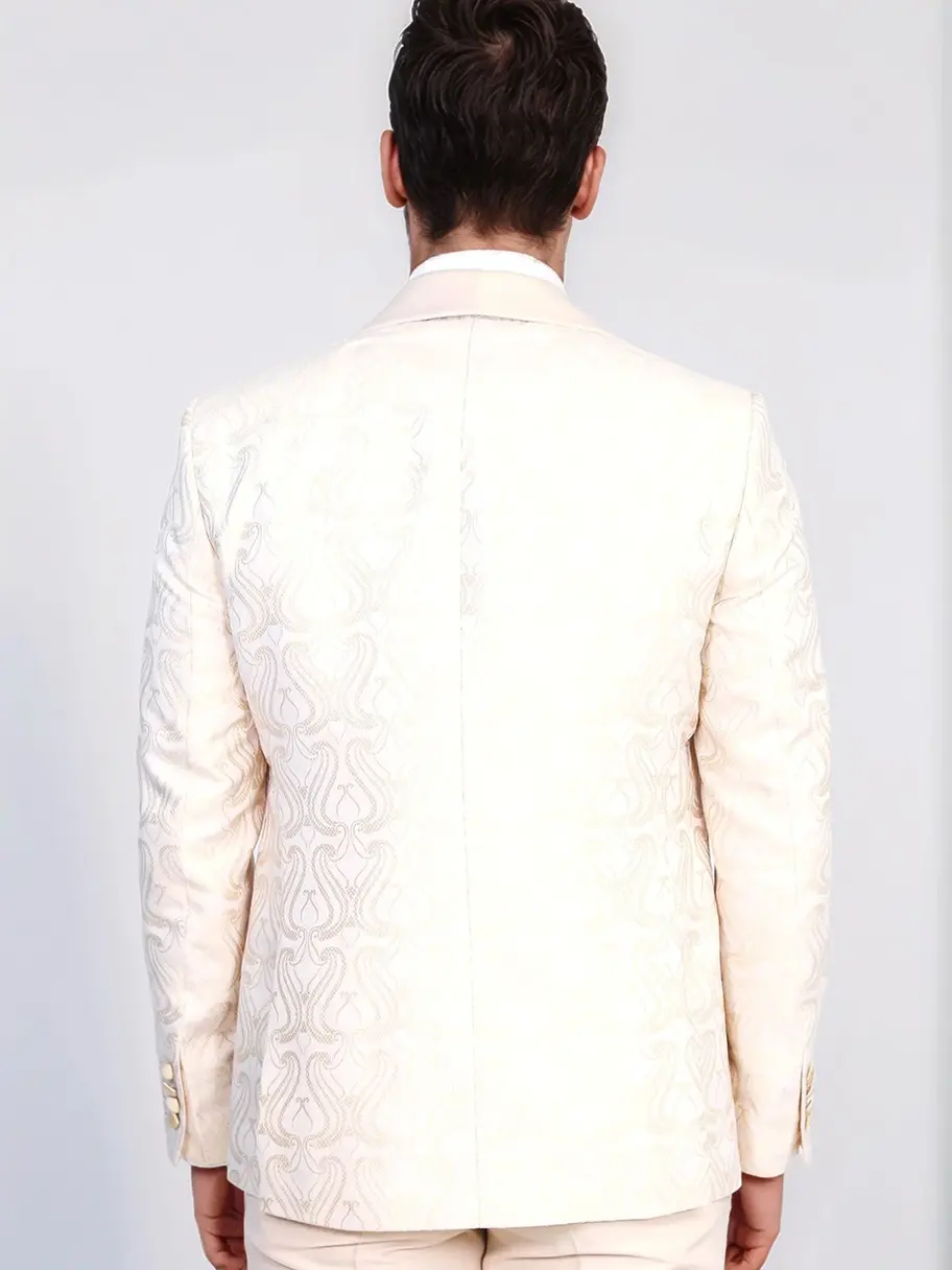 Refined, distinctive, and stylish — this cream tuxedo combines the elegance of a wavy patterned fabric with the timeless charm of a shawl collar and the sophistication of a matching vest. Perfect for weddings, galas, and exclusive evening events, it offers a unique three-piece look that sets you apart with elegance and confidence.