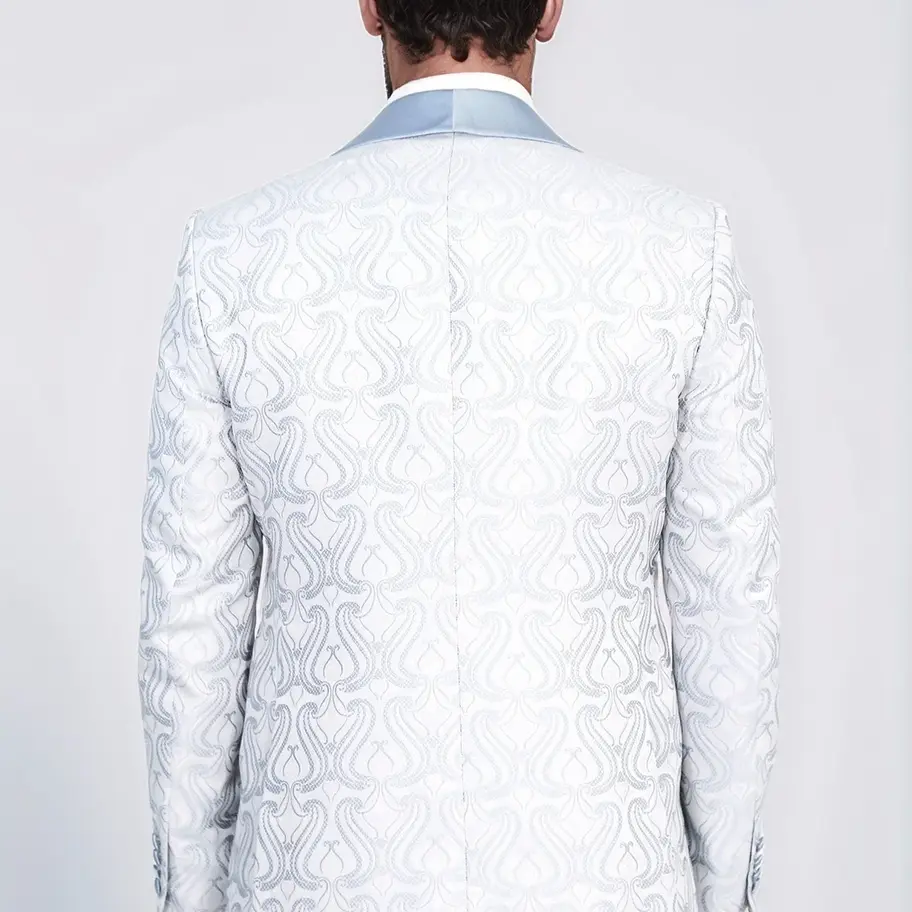 With its flawless craftsmanship and striking details, this wavy patterned vested ice blue tuxedo by D'Aurea will be a signature piece in any modern gentleman’s wardrobe.